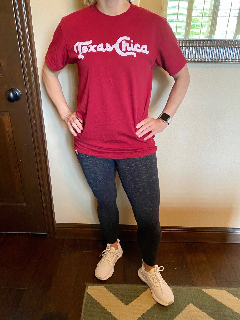 This quarantine look clearly made it out of the dryer right after the buzzer (the first time) and gone over with a warm iron before wear. The white shoes were purchased during an online shopping bender and have kept their whiter than snow look by social distancing inside. The nod to Texas on the t-shirt shows this is not an outfit to be messed with. The Apple Watch helps track the steps taken from the couch to the fridge and back. Never miss an opportunity for fitness.