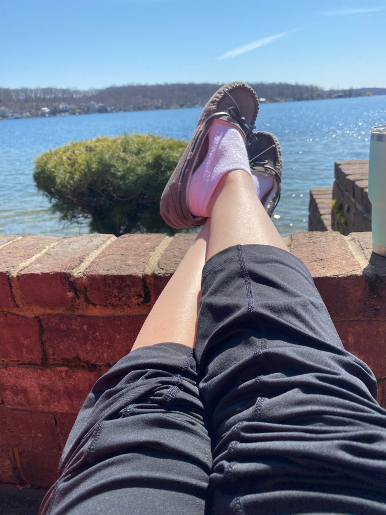 The “I wish it was summer but it SO isn’t” look. Pink fuzzy socks pair well with these moccasins from the 2019 Elizabeth Warren collection. The look says, I’m not afraid to go outside in my socks but I put shoes on in case I accidentally step in dog shit. The pants are “Quarantine fetch” created when leggings are worn for long enough for them to become baggy. The best part of this look will be the 7 inch tan line achieved that will be revealed during shorts season like a Chip and Jo episode reveal.