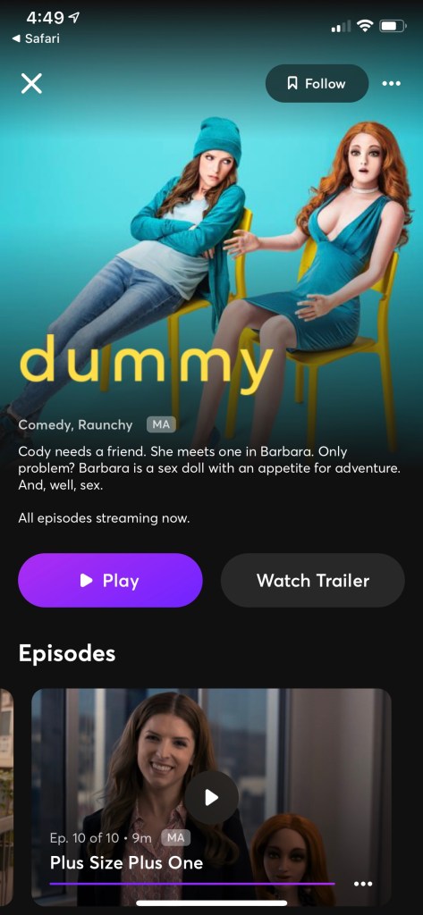 Finally a streaming service fit for the attention span of a gnat! A mobile only service with shows that range from 4-10 minutes in length. My favorite is a show called “Dummy” with Anna Kendrick. She is a writer who becomes friends with her boyfriend’s sex doll. After being stuck at home for a few weeks I really needed a series with 6 minute episodes about a sex doll and her BFF. It’s just as hilarious as it sounds and with a 3 month free trial, it costs nothing to try it out. Way cheaper than buying your own sex doll to be friends with.